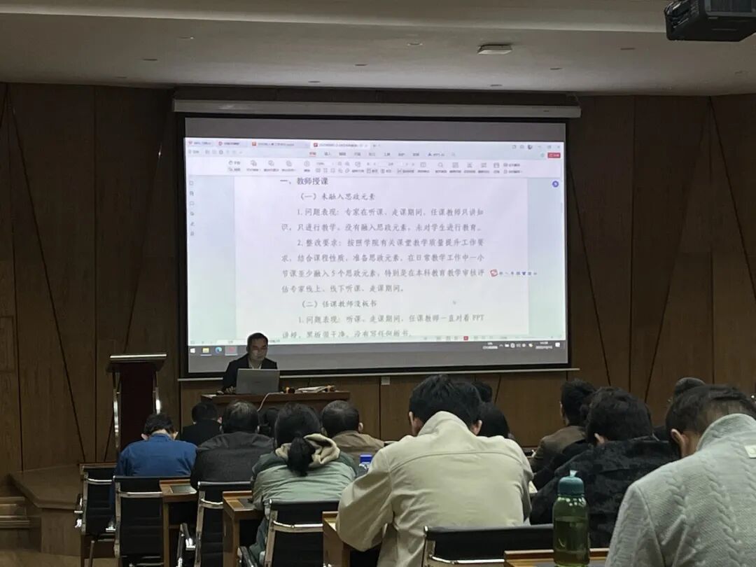 会议首先对前一阶段的评建工作进行了总结,通报了在教师授课、材料调阅、指令响应及校内外考察等环节中发现的问题,并明确了具体的整改要求与方向。