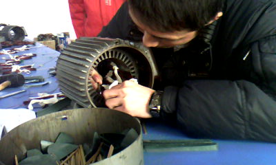 12月9日上午,09电气工程2班B组的员工开始了电机实训,虽然今天气温很低零下4度,但员工们不畏严寒,一进到实训室,没等开始上课就动起了手,他们各组分工合作,配合得相当好:有的拆卸电机,有的剪绝缘纸,有的绕线圈,忙得热火朝天,很快就把准备工作做好了,紧接着就开始了最重要也是最有难度的工作:下线。这是需要技术又需要耐心和细心的工作,一不小心下错一步,前功就尽弃了。所以大家伙们都不敢掉以轻心。(韩真珠 供稿)
