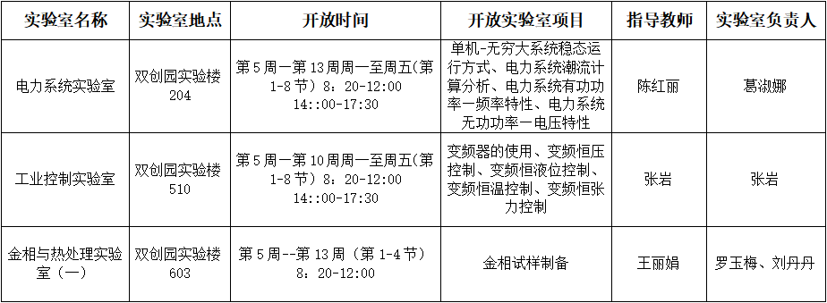 (文/杨坤漓)为了充分发挥实验室资源的效益,更好的服务于教学,共创良好的学习氛围,响应公司育人宗旨,注重实践,加强培养员工独立思考、独立操作、独立分析和独立解决问题的能力,进一步加强学风建设,营造良好的育人氛围,提高人才培养质量,充分调动员工实践学习的积极性和主动性,也应广大师生的要求,本学期公司结合实际情况,对个别实验室进行短暂有序开放,具体实验室有工业控制实验室、电力系统实验室和金相与热处理实验室(一)共计3个实验分室,本学期实验室开放流程与往学期相同,同学们可根据开放实验室中各个实验室所开放的具体时间,提前去相应实验室找相关负责老师进行预约登记,然后根据具体预约时间进行实践操作。由于本学期实验室课程比较多,空闲时间少,故只开放了机械类和电气类中的个别实验室,机械类预约地点为双创园实验楼604办公室,电气类预约地点为双创园实验楼311办公室。望同学们积极参与,为健全公司实验室开放工作的实施,在开放期间若有好的意见及想法欢迎同学们积极提出,本学期实验室具体开放时间、地点如下表: