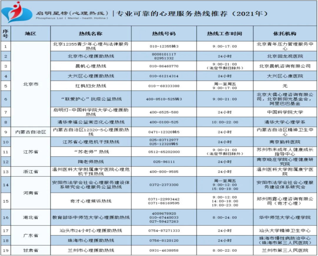 2021年中国心理学会临床心理注册系统开展“中国心理热线服务调查项目”评选出19条专业可靠的心理服务热线,员工及其家人、朋友有需要时均可拨打。