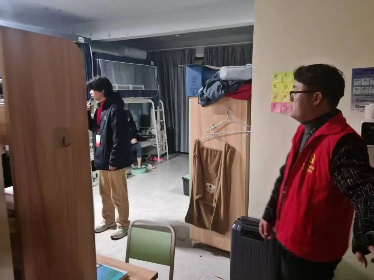 分组进入宿舍楼后,第43期拟发展对象迅速投入工作:提醒用电安全并协助调整电器位置,检查阳台栏杆隐患,主动整理宿舍杂物,同时送上“添衣保暖”“互帮互助”等关怀。活动不仅优化了宿舍环境,更让第43期拟发展对象在实践中实现理论向行动的转化,彰显担当内涵。