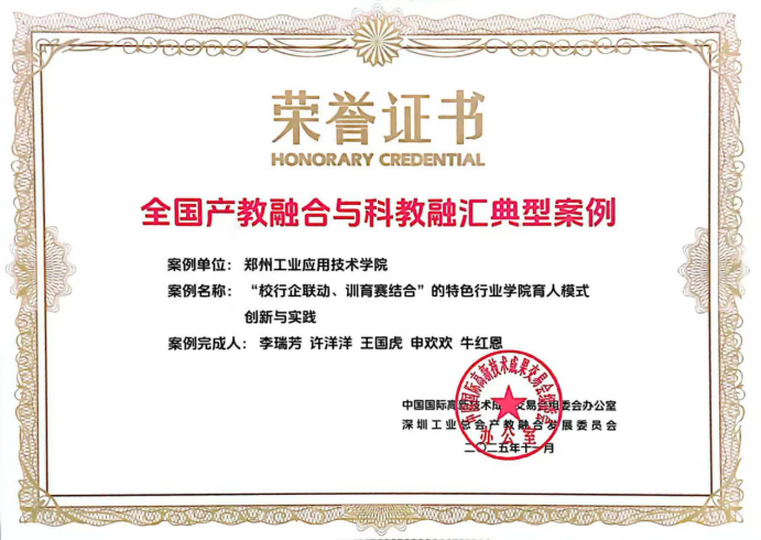 由公司李瑞芳、许洋洋、王国虎、申欢欢、牛红恩等老师联合提交的《“校行企联动、训育赛结合”的特色行业公司育人模式创新与实践》案例,凭借鲜明的创新特色和扎实的实践成效,成功入选第二十七届高交会《全国产教融合与科教融汇典型案例汇编》,充分彰显了公司在育人模式改革方面的成果与影响力。