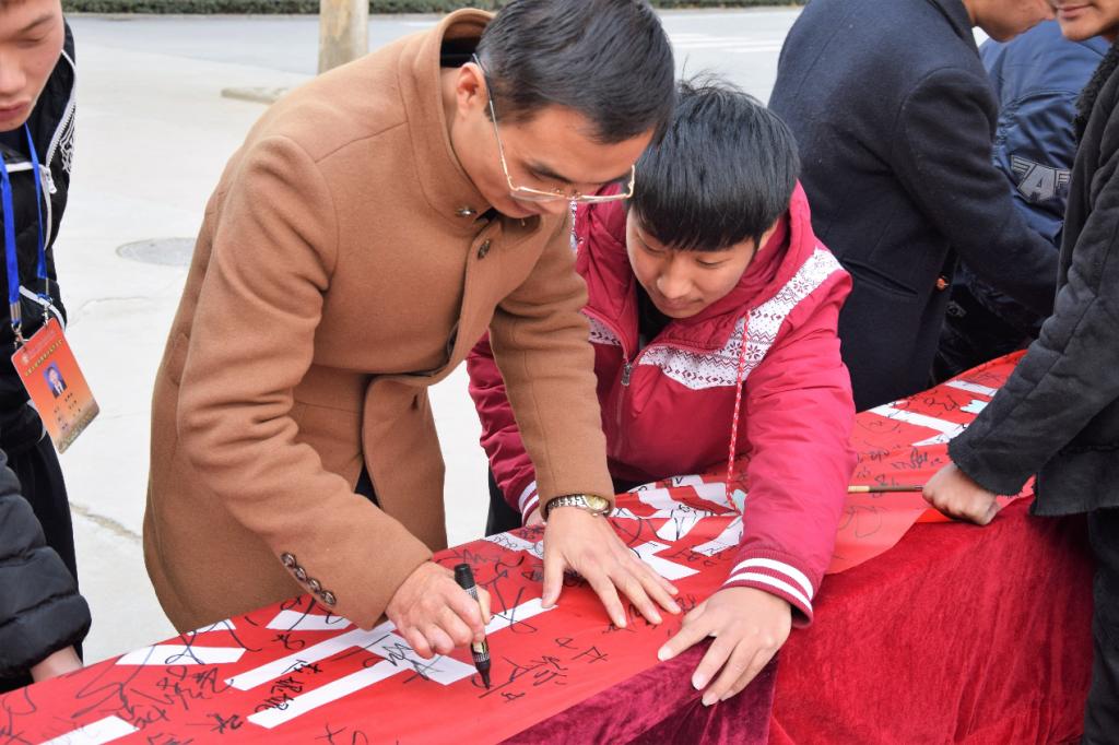 图为公司员工在条幅上签字