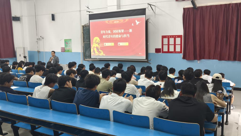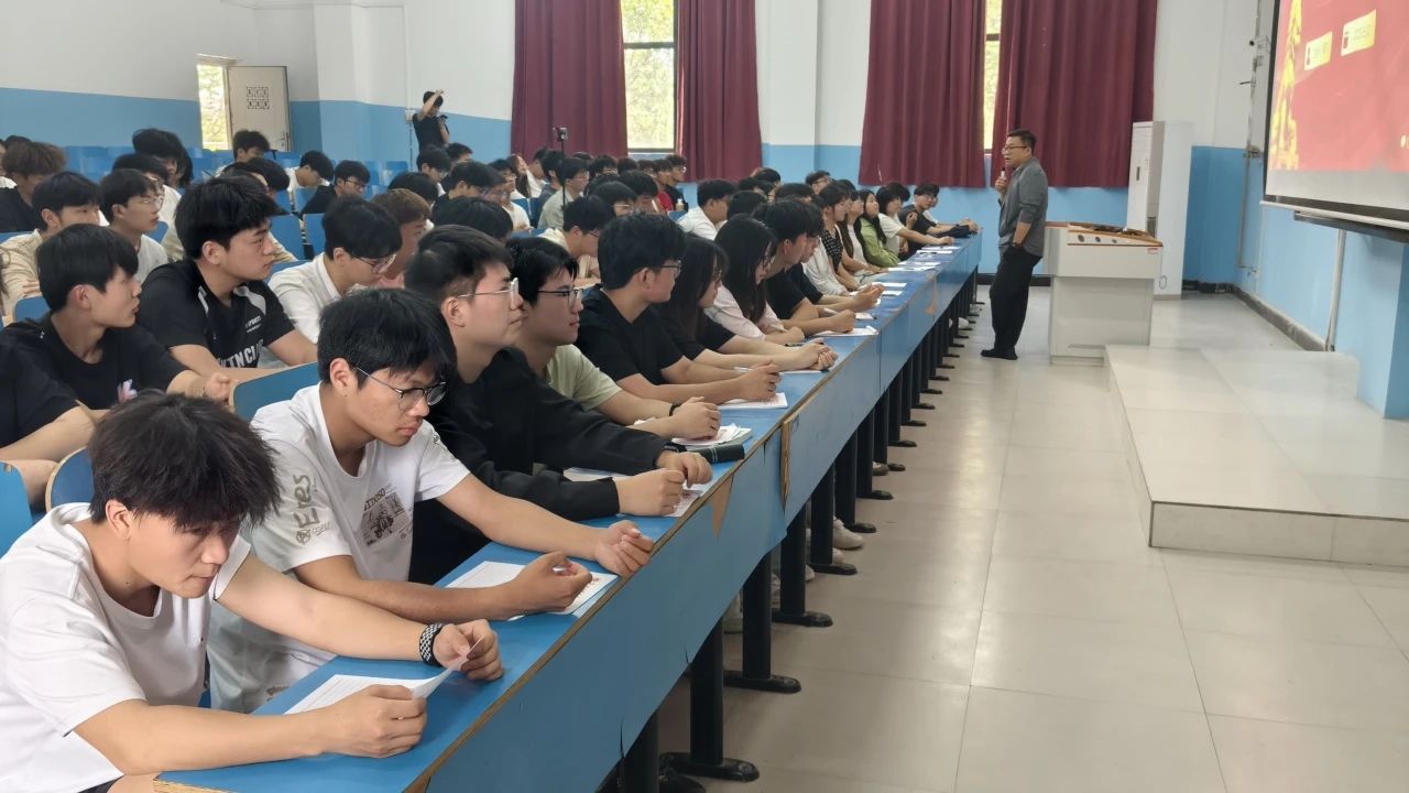 课堂上,薛飞老师结合历史与现实,通过丰富案例深入解读青年使命。从五四运动中青年员工高举爱国旗帜、为民族觉醒奔走呐喊,到新时代航天团队以创新突破“卡脖子”技术、抗疫青年志愿者逆行守护生命防线,生动展现了不同时期青年在国家发展中的关键作用。薛飞老师强调:“新时代青年是实现第二个百年奋斗目标的生力军,既要仰望星空,将个人理想融入国家发展大局;也要脚踏实地,用知识和实践锤炼过硬本领。”互动环节中,入团积极分子踊跃举手参与。其中董云龙同学结合自身参与社区志愿服务的经历分享感悟:“青年的担当不仅是一句口号,更体现在服务社会的每一件小事中。”薛飞老师从科技创新角度提出:“我们要以专业知识为武器,在科技强国建设中贡献青春智慧。”现场气氛热烈,碰撞出思想的火花。