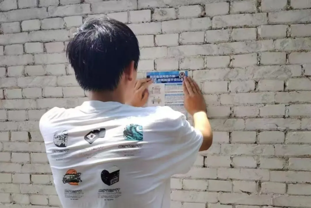 反诈宣传是赵巍豪此行的重要任务。在村庄白砖墙下,他专注张贴反诈海报,白色T恤后背的海浪与相机图案随动作轻晃。他踮脚抚平海报边角,力求粘贴牢固,盼为村民筑牢“钱袋子”的安全屏障。