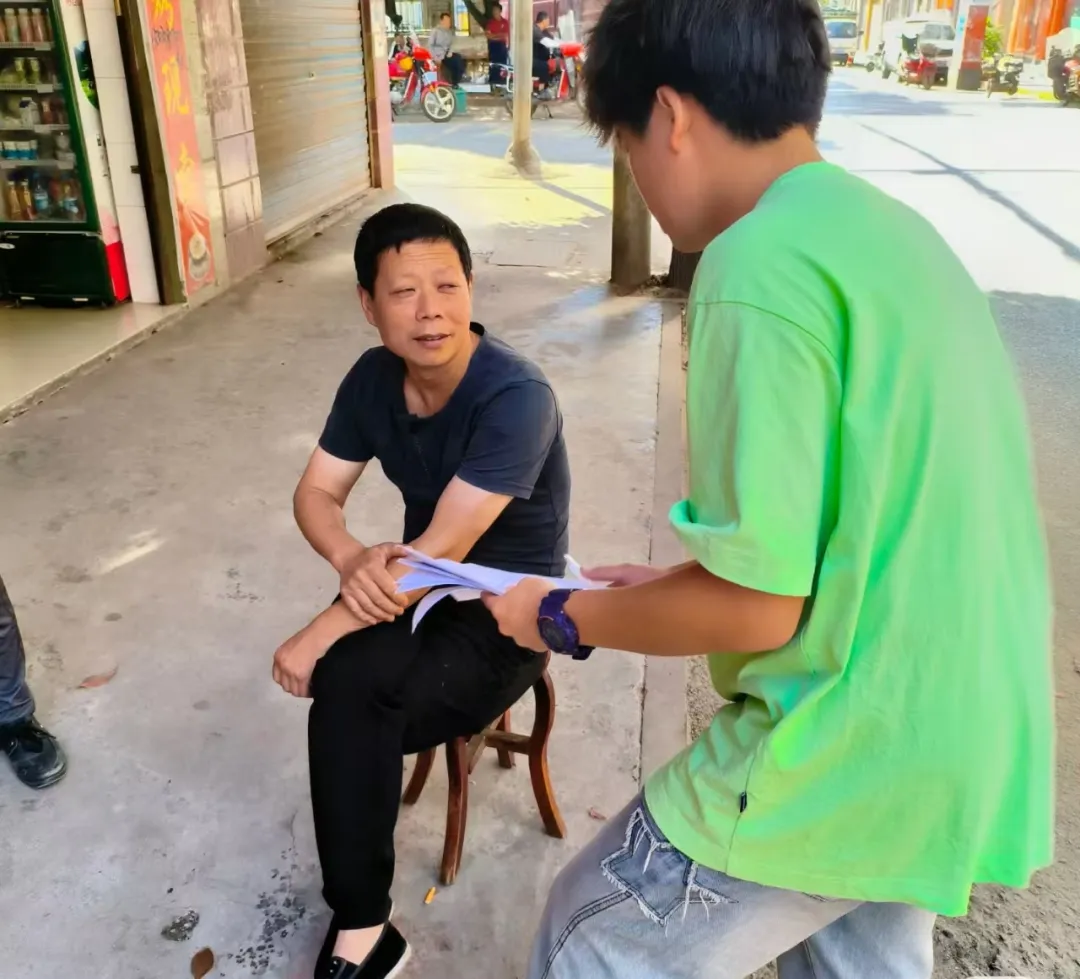 不止于静态宣传,赵巍豪主动“走出去”。在村道旁,遇到坐小板凳的村民,身着绿色T恤的他俯身递上宣传资料,用通俗易懂的语言、专注真诚的神情讲解反诈知识。一来一回的交流里,反诈意识悄然在村民心中扎根。
