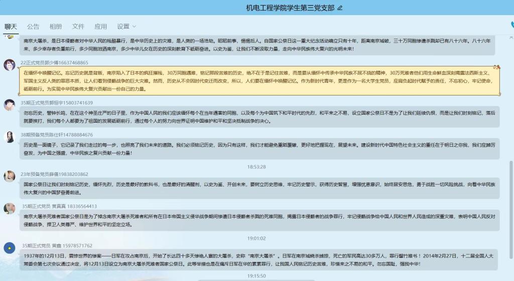 正式党员韦春琦表示:勿忘历史、勿忘耻辱、勿忘那个年代我们受辱的局面,珍惜革命先烈用血拼出来的天下,珍惜我们生活的环境,珍惜来之不易的生活。惨痛的历史面前,我们不仅要铭记真实的历史,更要吸取经验教训,明白落后就要挨打,落后就永远处于被动受辱的地位,任何时候,都要努力强大我们自身,只有中国强大了起来,立于世界强国之席,让外国侵略者不寒而栗,那我们才真正是不战而胜。