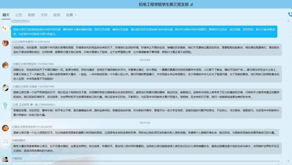 预备党员高亚东表示:国家公祭日为的是唤起我们对和平的珍视,缅怀南京大屠杀遇难同胞,用好红色资源,赓续红色血脉,强化我们的历史使命感与时代责任感。我们作为新时代的中国青年,要做到不忘历史、铭记英雄、居安思危、初心不渝、积极进取,为实现中华民族伟大复兴而奋斗。