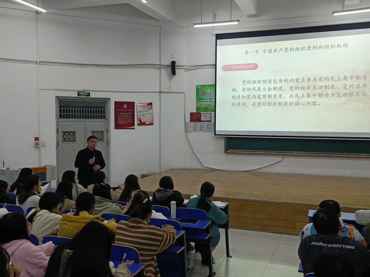 随后张卫涛老师又从“党的纪律特征”、“民主集中制的基本原则”要求每一位入党积极分子认真学习,时刻严格要求自己,做到“讲规矩,守纪律”,发挥好先锋模范代表作用。