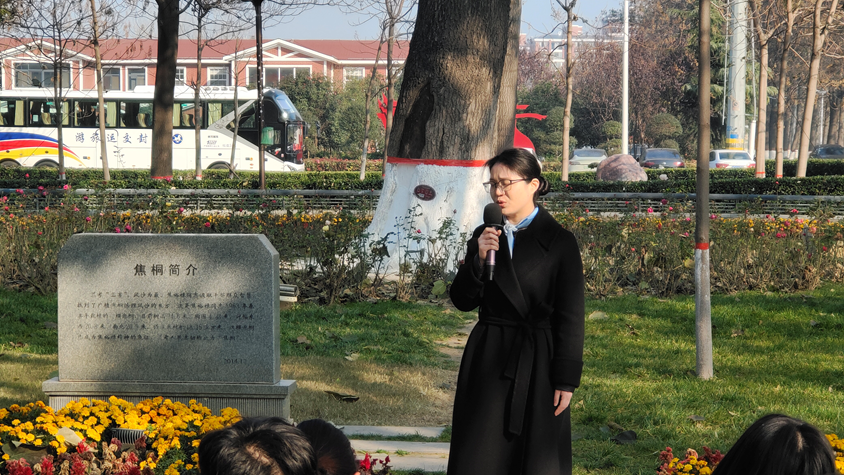 在焦桐广场,那棵历经风霜却依旧挺拔的“焦桐”,不仅是兰考变迁的见证者,更是焦裕禄精神代代相传的象征。成员们聆听“焦桐”守护人讲述焦裕禄同志治风沙、排内涝、除盐碱的故事。之后,围绕“焦桐”,成员们用青春的声音讲述着新时代的故事,将党的二十大精神与焦裕禄精神巧妙融合,让在场的每一个人都能感受到那份来自心底的震撼与共鸣。