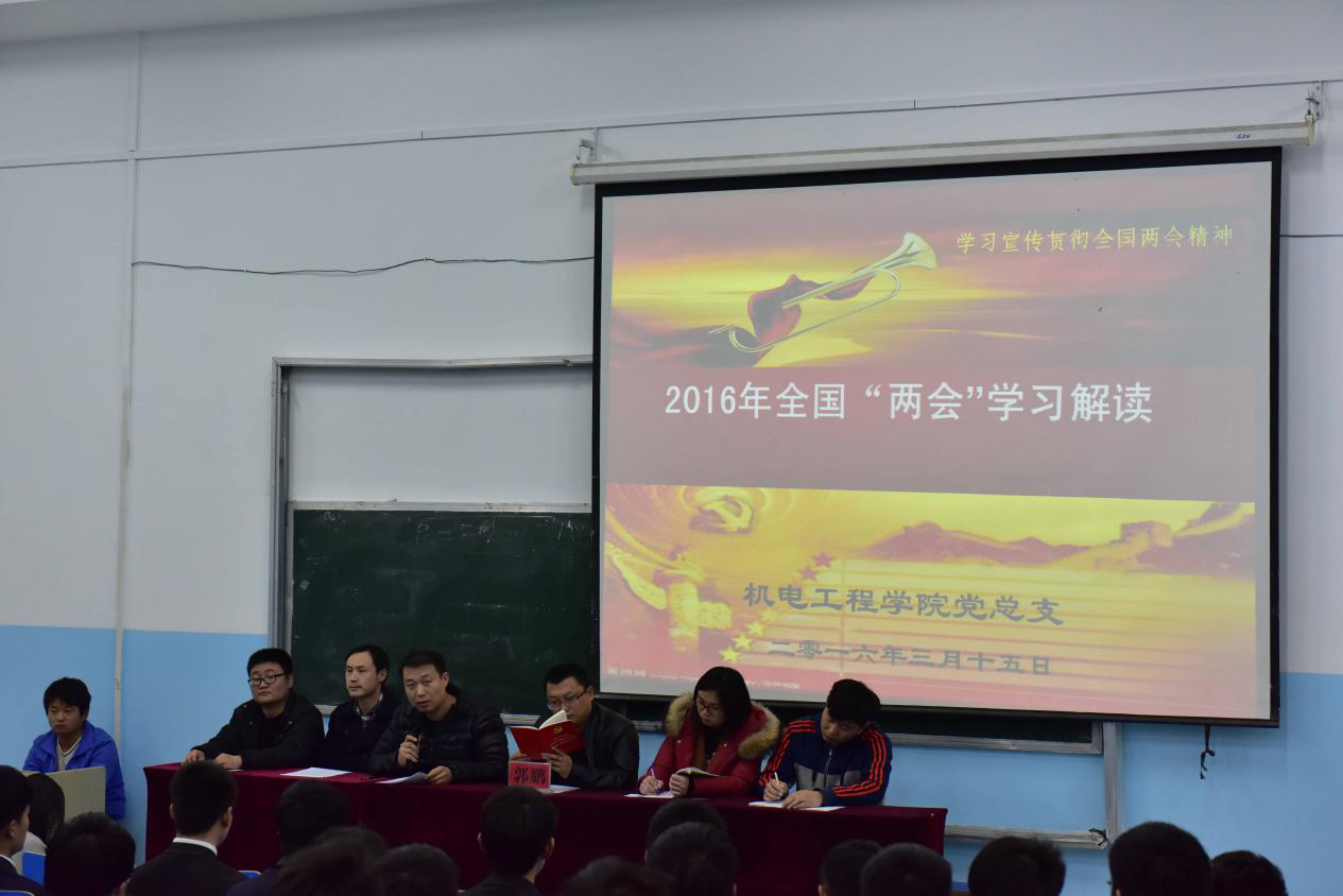 2016年3月15日晚上,公司党总支在西校区科技信息大楼KX1-2教室就2016全国两会精神进行解读。出席本次会议的有公司党总支书记郭鹏同志,公司组织委员李冬冬同志以及支委全体成员,会议由公司组织委员李冬冬同志主持。