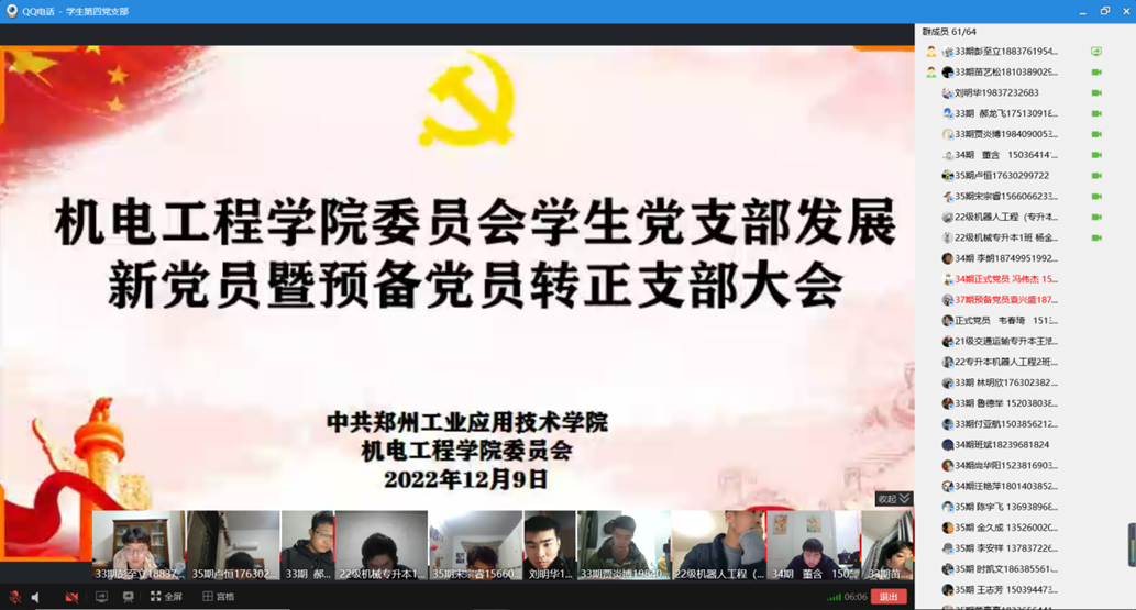 2022年12月9日晚上8时,beats365唯一官方网站员工第四党支部以线上视频的方式顺利召开了发展新党员暨预备党员转正会议,旨在吸纳优秀员工壮大党员队伍,为支部将来的发展打下坚实的基础。会议由党支部副书记彭至立同志主持,党支部全体成员参加会议。