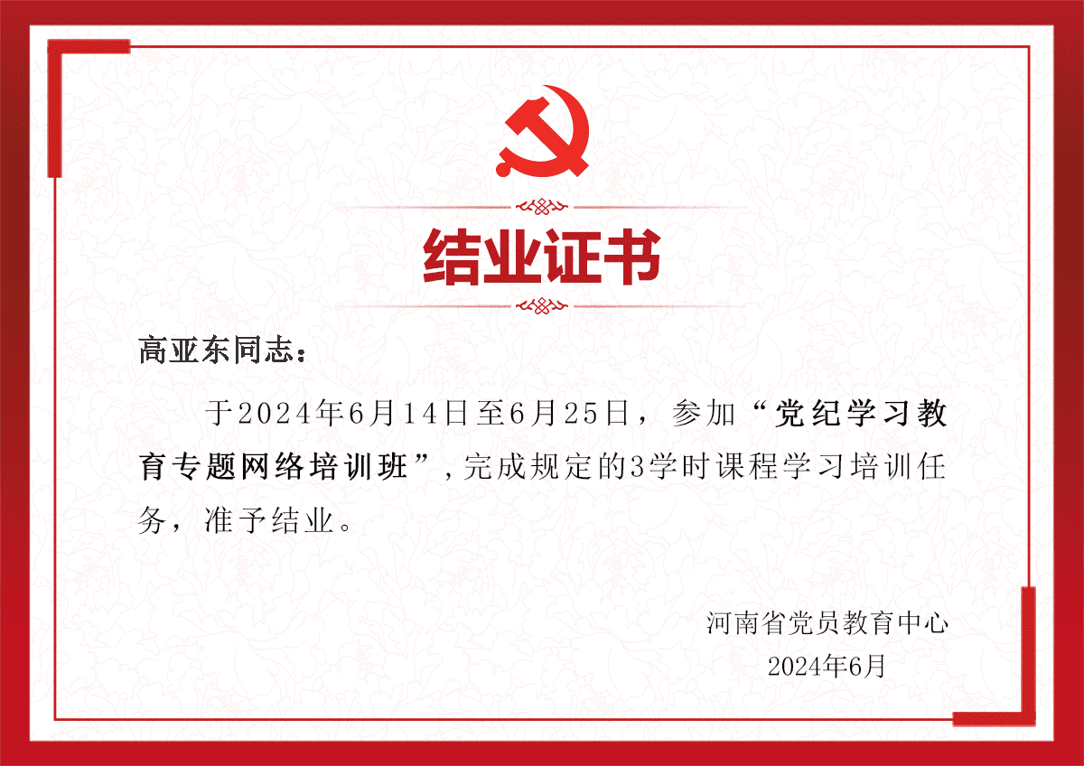 (文/齐超 图/夏高祥 高亚东)根据省委党纪学习教育工作专班安排,省委组织部举办河南党员教育“云课堂”(全省党员党纪学习教育专题网络培训班),为了进一步加强员工党员的党性修养,提高党员的纪律意识,引导全体员工党员做到学纪、知纪、明纪、守纪。2024年6月18日,公司党委组织全体党员通过“云课堂”参加全省党纪学习教育专题网络培训班。