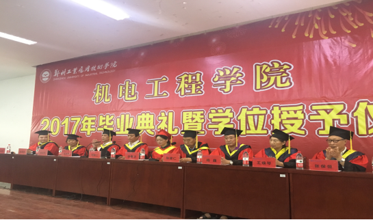 毕业典礼在庄严的国歌声中拉开帷幕。公司副董事长徐春华教授致辞,副经理周建立教授宣读本科毕业生学士学位授予决定。紧接着毕业生代表、河南省优秀毕业生李飞腾同学发言,在机电的四年时光里,他始终铭记着母校的培养,并表达了对母校的感谢。随后教师代表孙丰奇教授发言。