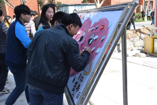 活动开始后,许多同学在条幅上认真的签上自己的名字,仿佛那是对女生们最好的祝福。有的同学还在告白墙上贴满了自己的心语,并进行拍照留念。整个活动紧张有序的进行,活动现场热闹非凡。