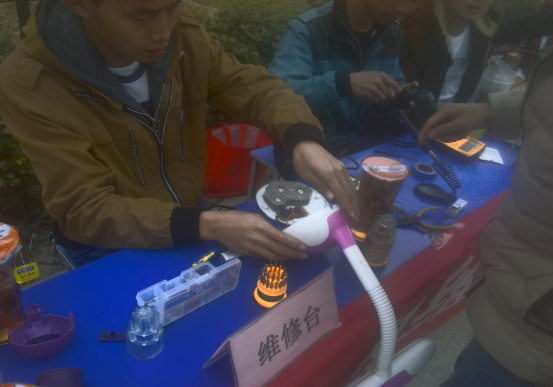活动中由协会接待处对前来维修物品的同学询问所出现的故障,帮助同学们分析产生故障的原因,以便进行针对性的维修。在维修中主要有我们技术部的成员和老师对物品故障进行检测处理。