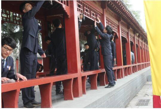 早上八点公司员工统一穿着校服并自带卫生工具来到了景区。景区负责人给同学们分配完任务,员工们便开始了清扫工作。同学们打扫卫生的热情很高,即使灰尘很厚,也不怕脏不怕累,依然耐心而细致地打扫着卫生。活动中,新郑市电视台还对同学们进行了采访,胡华乐同学告诉记者,我们到景区义务打扫卫生,不仅是为了践行雷锋精神,为即将到来的2016年拜祖大典做出自己的贡献,还希望以自己的实际行动引起大家的环保意识,更希望自己的劳动能够吸引社会公众的关注,在每一个人的潜意识中种下“环保”这颗种子,使我们的环境变得更加美好。