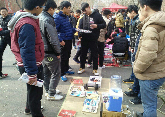 我们生活部提前两天通过网络,小黑板和上门宣传等方式宣传。在2015年12月11和12日在沣泽园前成才大道上举行跳蚤市场活动。在活动上各种质料书籍和各类器材吸引许多人的眼球,许多买家驻足为看重的东西与卖家讨价。