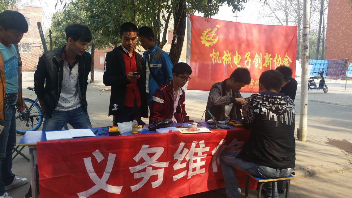 2015年10月17日早上8点半,活动人员在机械电子创新协会会长郭岩彬的带领下做好活动准备。此次活动是在西校区医公司五号宿舍楼门前开展的。在活动一开始就引起很多同学前来询问,活动现场气氛融洽,维修人员都忙的不亦乐乎,他们在各自岗位上挥洒着热情、倾注着努力。机械电子创新协会义务维修活动是结合协会自身特色、通过自己所学的专业技能、面向全校师生开展的义务维修服务活动,为全校师生解决在电气方面遇到的各种疑难问题。