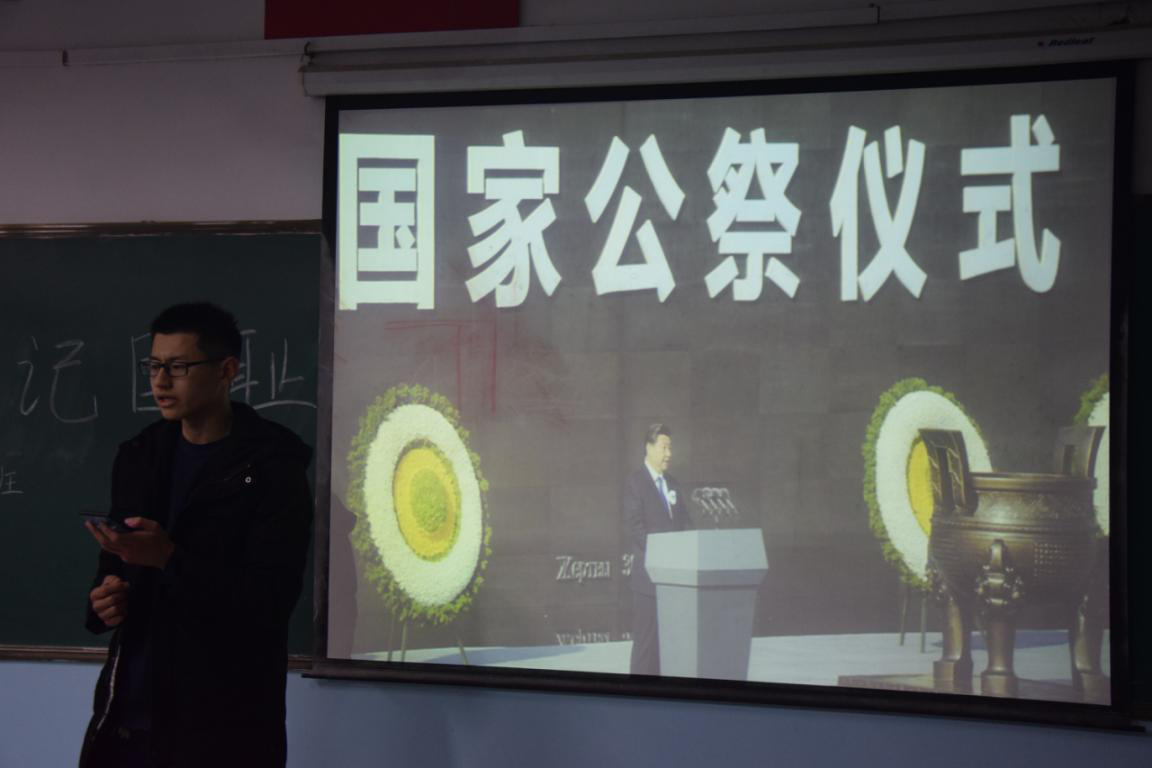 活动伊始,全体同学一同伫立,为81年前的无辜死难者默哀一分钟。默哀结束后,各班团支书向同学们介绍国家公祭日的相关知识及其重要意义。为直观了解那段沉痛的历史,深刻缅怀无辜的死难者,各班团支书为同学们播放相关的历史短片,放映过程中,全场肃穆安静,气氛沉重而严肃。银幕中播放着一幕幕令人愤慨的屠杀场面,黑白色调更显得森严悲壮。最后,同学们进行交流互动,唤起了大家对和平的向往、坚守!
