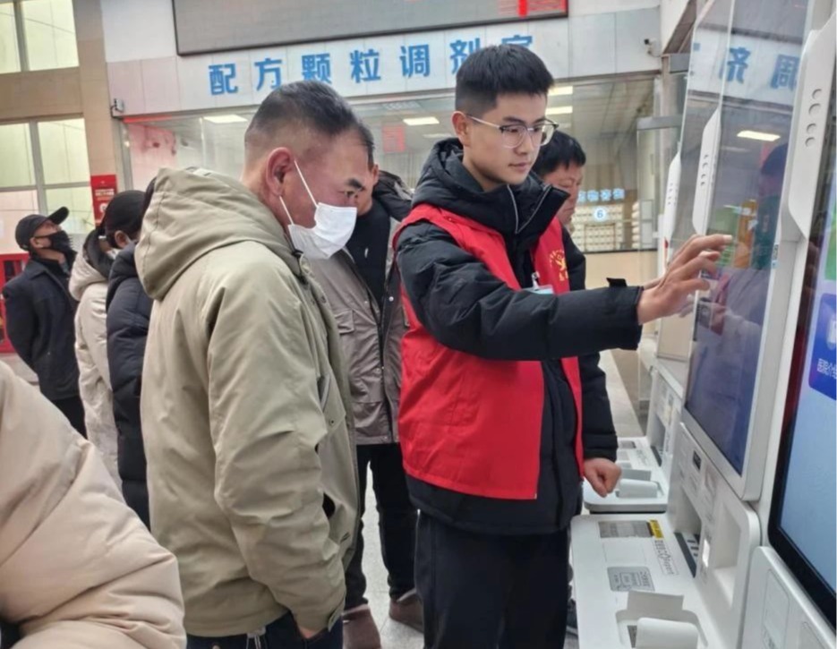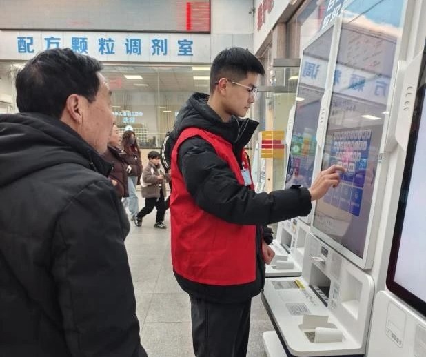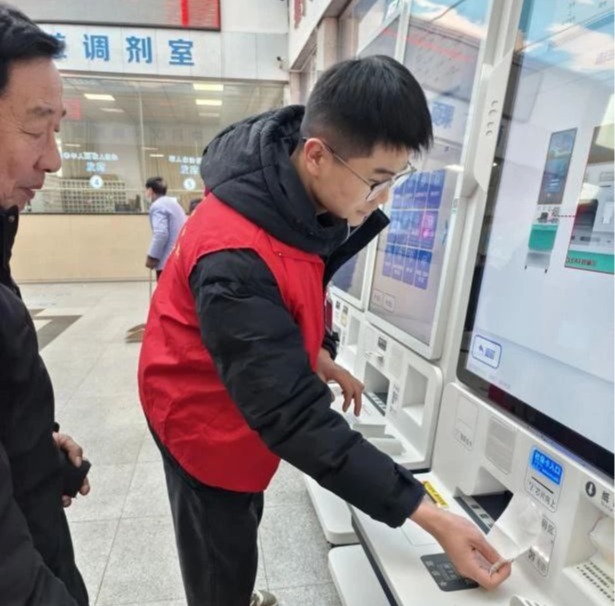 挂号环节往往是患者就医的第一道“关卡”,由于患者来源广泛,对医院流程大多不熟悉,志愿者在此发挥了关键作用。遇到携带齐全身份证、医保卡等证件的患者,志愿者会迅速引领他们来到自助挂号机旁,耐心细致地指导操作。