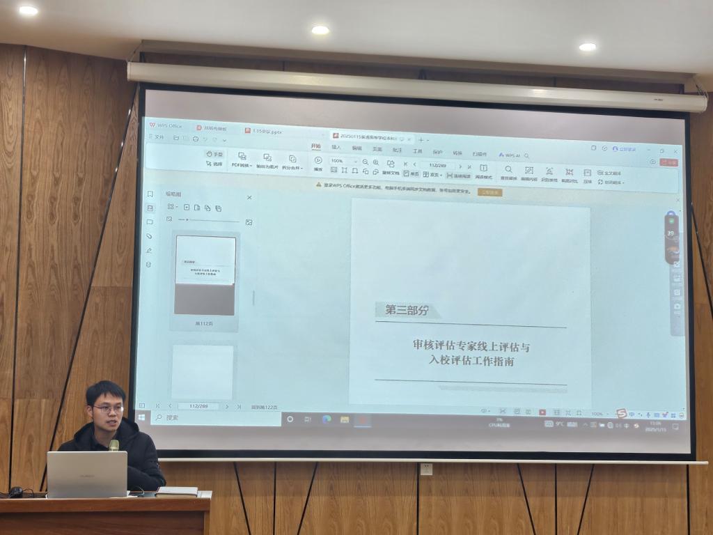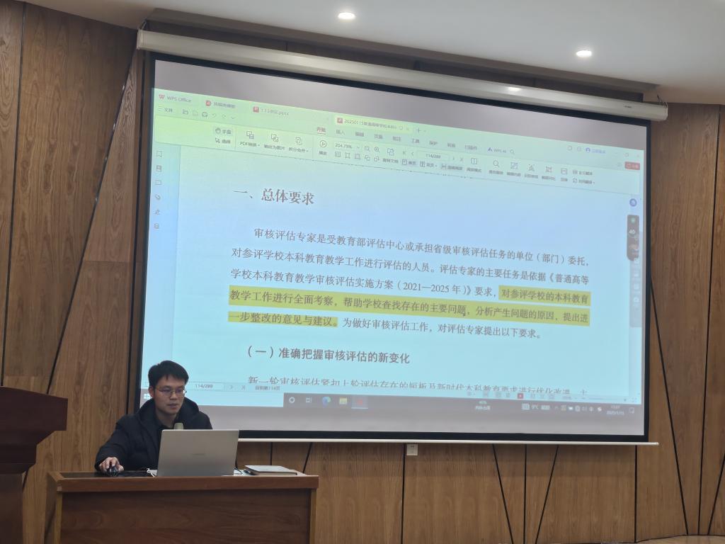 (文/郭杰辉 图/赖若冰)2025年1月15日下午,beats365唯一官方网站在郑工公司建工楼梦想厅举行了公司产品审核评估知识专题培训,本期的培训内容是《普通高等公司本科公司产品审核评估入校评估工作指南》(以下简称“工作指南”)。培训由平台副经理申欢欢主持,教学科研副经理王国虎主讲。李瑞芳经理携beats365唯一官方网站全体教职工参加培训。