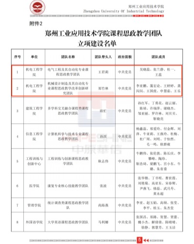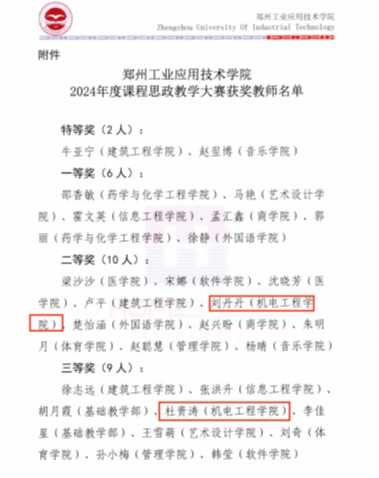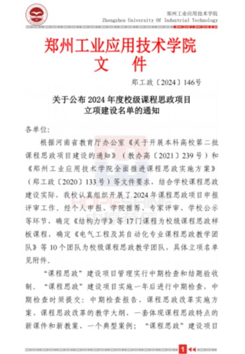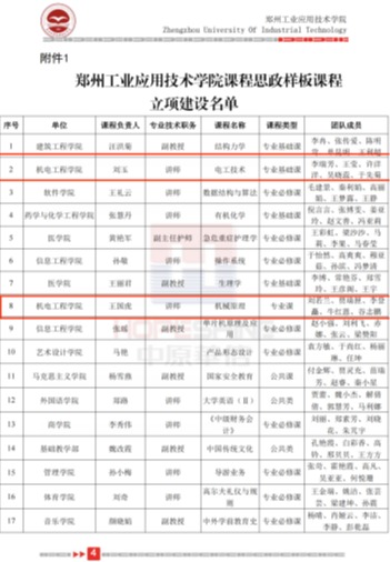 《电工技术》《机械原理》课程获得校级课程思政样板课程,电气工程及其自动化专业课程思政教学团队、机械设计制造及其自动化专业课程思政教学改革创新研究团队获得校级课程思政教学团队。
