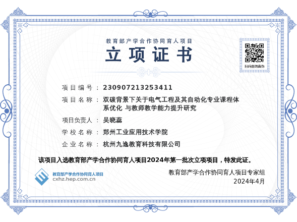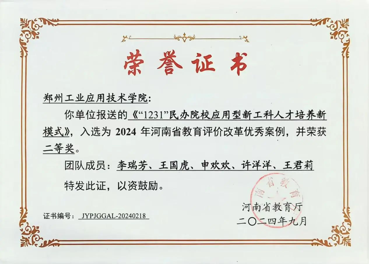 1.《“1231”民办院校应用型新工科人才培养新模式》入选为2024年河南省教育评价改革优秀案例,并荣获二等奖。