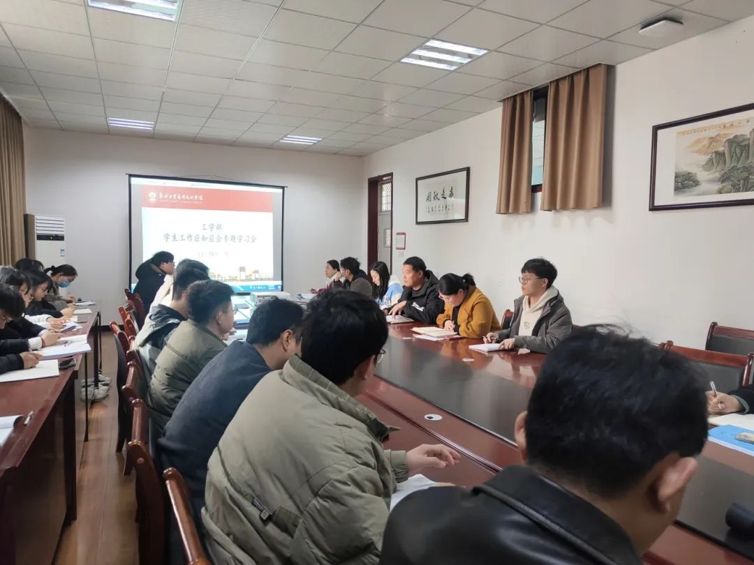 工学部于3月18日下午开展员工工作应知应会专题学习会。党委书记、学管副部长郭二灿,分团委书记刘贝贝、徐明慧,全体辅导员参会。